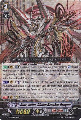 Take Kagero and Narukami for example. How are they different? They're both heavily rooted in the retire mechanic. Recently, Narukami have started to gear themselves more towards binding cards (but that itself starts treading into Nubatama territory), and the only real difference between them and Kagero are that most of Narukami's cards are retire and beatdown, whereas Kagero are more retire and restand (if you're playing an "Overlord" deck). In all honesty, these two clans could be combined into a single one and the game would be no worse for the wear (Narukami only ever came to be because Bushi wanted to stop supporting Kagero, anyway). For the purpose of this article, I'll call this combined clan "Control". Gear Chronicle could be included in this as well, as their "Go to the bottom of the deck" mechanic is just an upgraded form of retire, and the rest of their clan is nothing but Silent Tom wannabe's and other forms of guard restriction, which is just cancerous to have en masse.