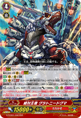 The on-stride unit (Or Breakstride, Stride Bearer, whatever terminology you prefer) for Tachikaze who, like much of the rest of the clan, was named by Bushiroad's Redundancy Department of Redundancy. Setting the repetitive name aside, his skill is actually a god-send for the clan. His Generation Break 2 is a standard "Gain 5,000 and a Critical for a cost/condition" that most of the old stride bearers had, and it would have been nice to get something creative and maybe defensive, but beggars can't be choosers I suppose. His on-stride skill more than makes up for the lackluster GB2, though.